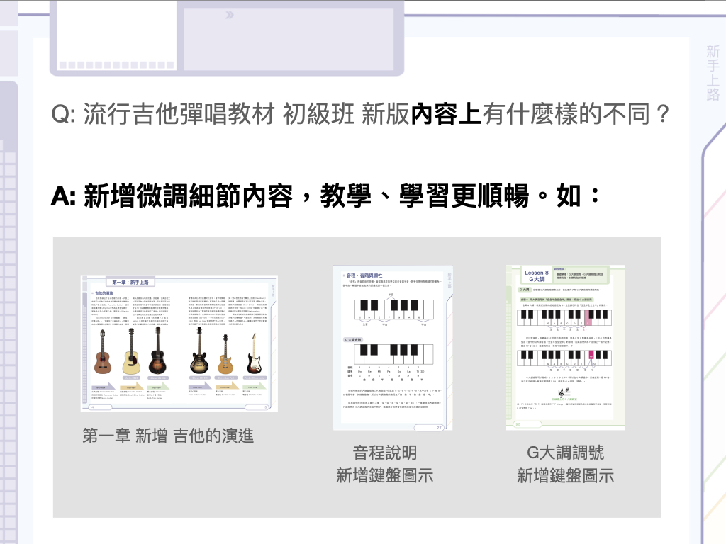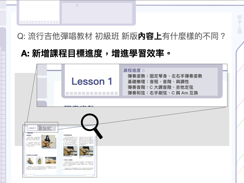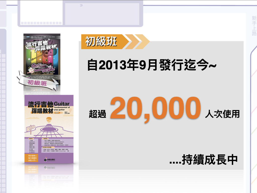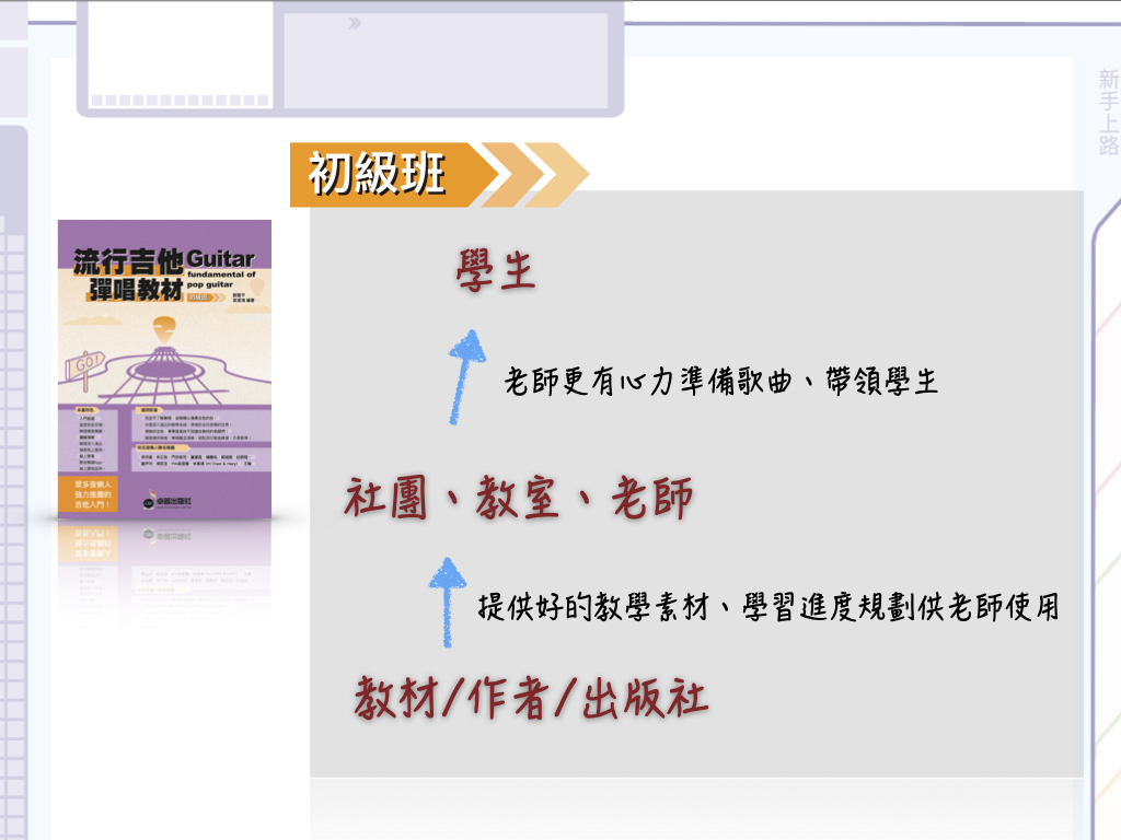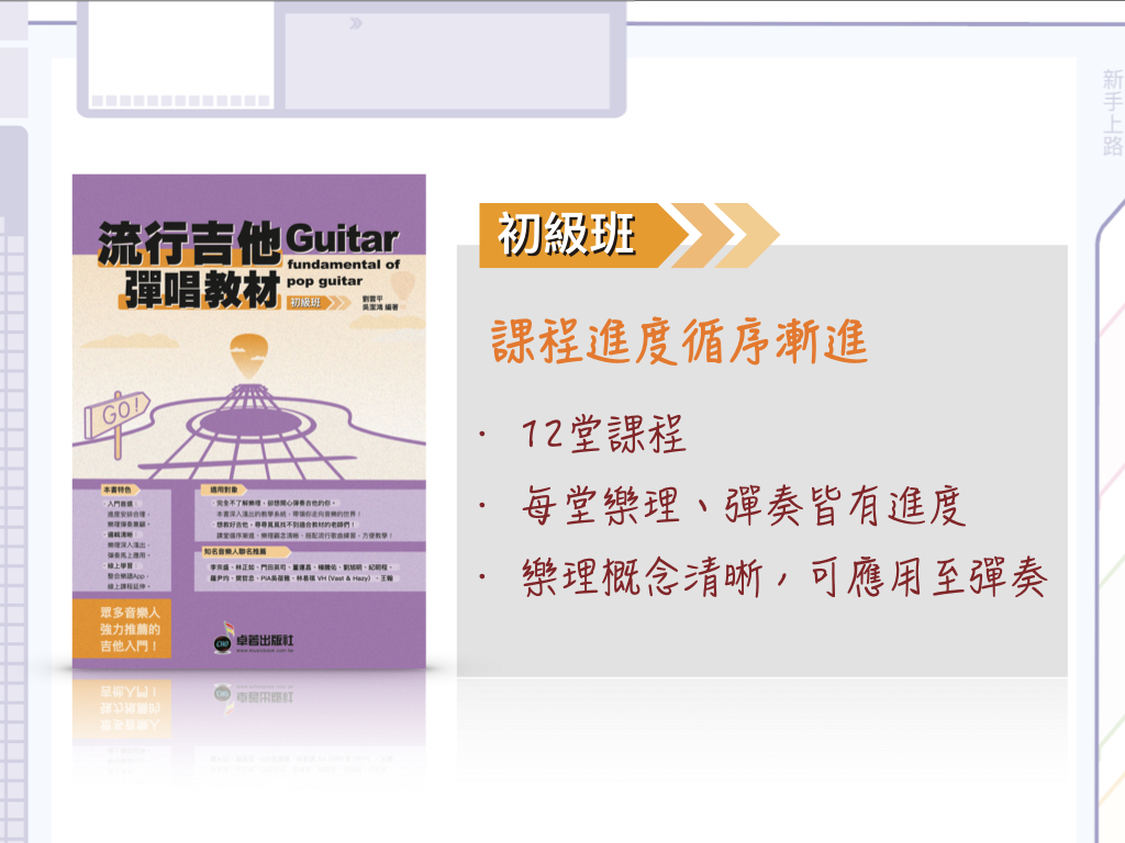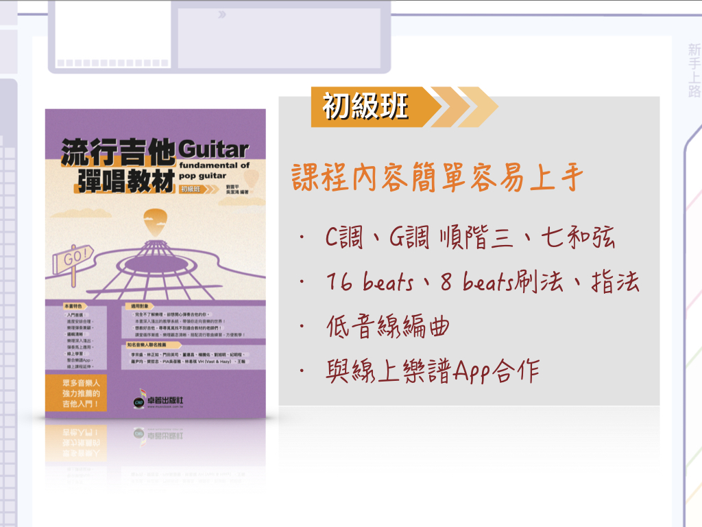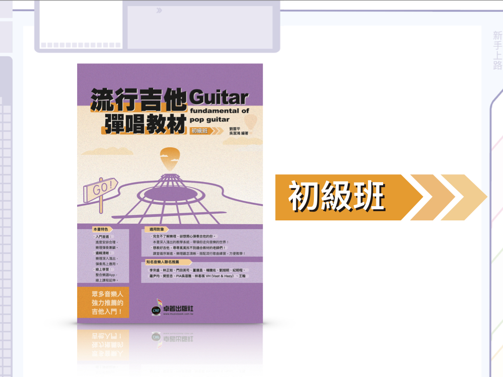 ・想教好吉他,尋尋覓覓找不到適合教材的老師們!課堂循序漸進、樂理觀念清晰、搭配流行歌曲練習,方便教學!